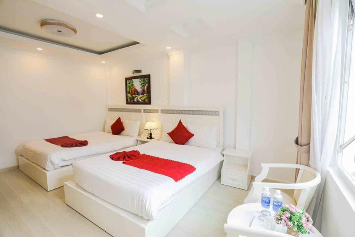 Không gian phòng được thiết kế rộng rãi, bố trí 2 giường đơn (hoặc giường đôi tùy chọn) với đệm dày êm ái, drap trắng tinh khôi và chăn ấm phù hợp khí hậu Đà Lạt.